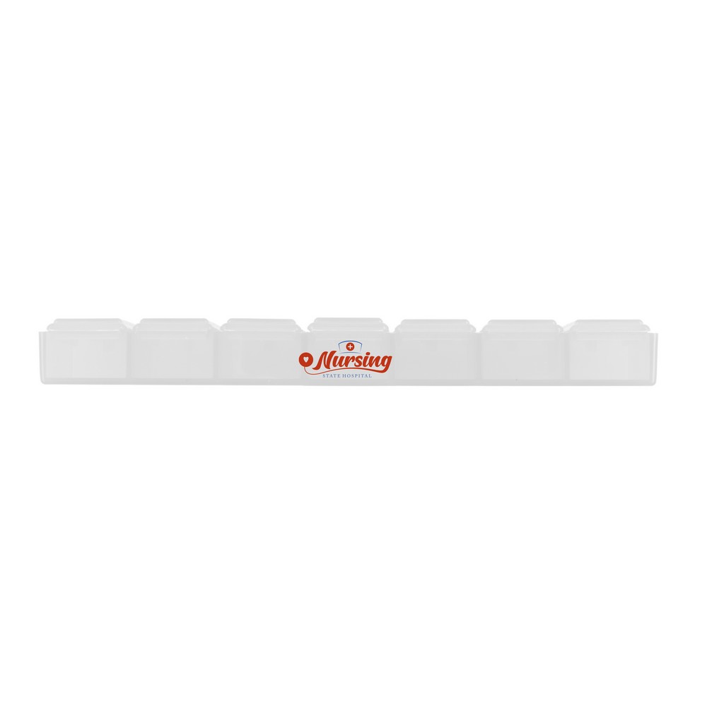 Die semi-transparente Pillendose mit 7 Fächern ist der perfekte Imageträger für Ihre Marke. Mit kompakten Maßen von nur 14,5 x 3,5 x 1,2 cm und einem Gewicht von lediglich 25 g vereint sie Funktionalität und ansprechendes Design. Jeder Beschenkte wird die praktische Aufbewahrung und Organisation von Vitaminen oder kleinen Gegenständen schätzen, was den Alltag erleichtert. Für Ihr Unternehmen bedeutet dies langfristige Sichtbarkeit: Ihr Logo wird täglich in Verwendung sein und bleibt so nachhaltig im Gedächtnis.