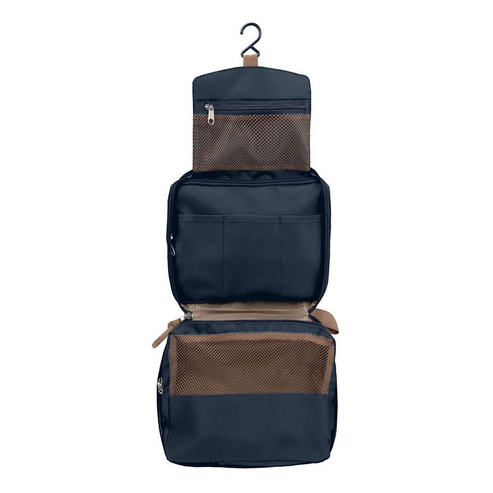 Die RPET Kosmetiktasche ist der perfekte Imageträger für Ihr Unternehmen. Mit ihrer eleganten dunkelblauen Farbgebung und der hochwertigen Verarbeitung aus 300D RPET bietet sie nicht nur ein stilvolles Design, sondern auch praktische Funktionalität. Die drei Innenfächer mit Reißverschluss und zusätzlichen kleinen Fächern organisieren Kosmetikartikel und erleichtern den Alltag ваших Kunden. Der integrierte Haken für das Aufhängen macht sie zudem ideal für Reisen.